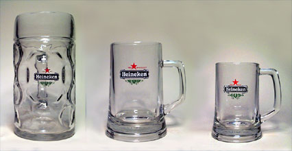 Effen glas, toelopende vorm, oor rechts, "Heineken Beer Premium Quality" in reliëf in de bodem |
